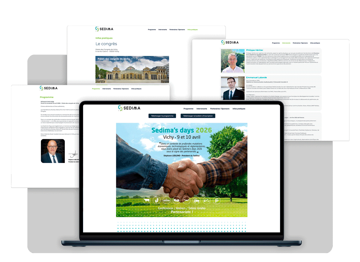 Le syndicat professionnel Sedima nous a demandé, une nouvelle fois cette année, de créer l’identité de son congrès annuel et de la décliner sur l'ensemble des outils de communication (mailing, site internet, programme, signature mail, roll-up, encart presse, templates des présentations, tote bag, …)